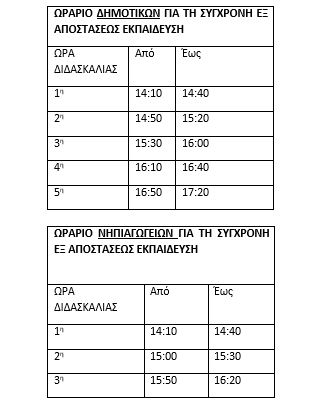 • Σύγχρονη τηλεκπαίδευση: Από τη Δευτέρα, οι διευθύνσεις των σχολείων σε συνεργασία με τους εκπαιδευτικούς, θα καταρτίσουν πρόγραμμα σύγχρονης τηλεκπαίδευσης και θα κάνουν τις απαραίτητες δοκιμές. Η τηλεκπαίδευση θα ξεκινήσει την Τετάρτη, μετά τη σχολική αργία της 17ης Νοεμβρίου. Θα είναι υποχρεωτική, η κάθε διδακτική ώρα θα έχει διάρκεια 30΄ και θα πραγματοποιείται από τις 2 έως τις 5 μ.μ. για τα δημοτικά, και από τις 2 έως τις 4:20 μ.μ. για τα νηπιαγωγεία, συμπεριλαμβανομένων σύντομων διαλειμμάτων.