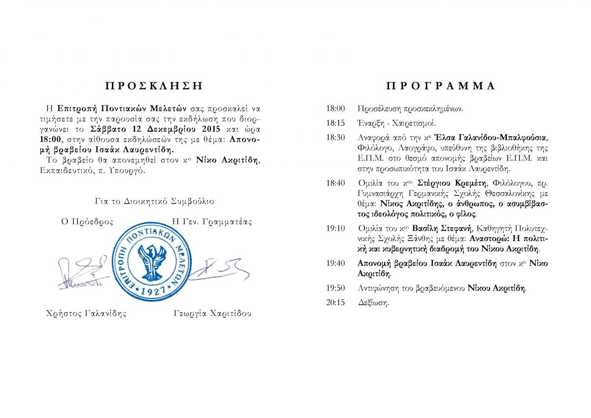 Με το βραβείο «Ισαάκ Λαυρεντίδης» η Επιτροπή Ποντιακών Μελετών τιμά τον Νίκο Ακριτίδη, τον πρώην υπουργό και εκπαιδευτικό από τον Καταχά Πιερίας.