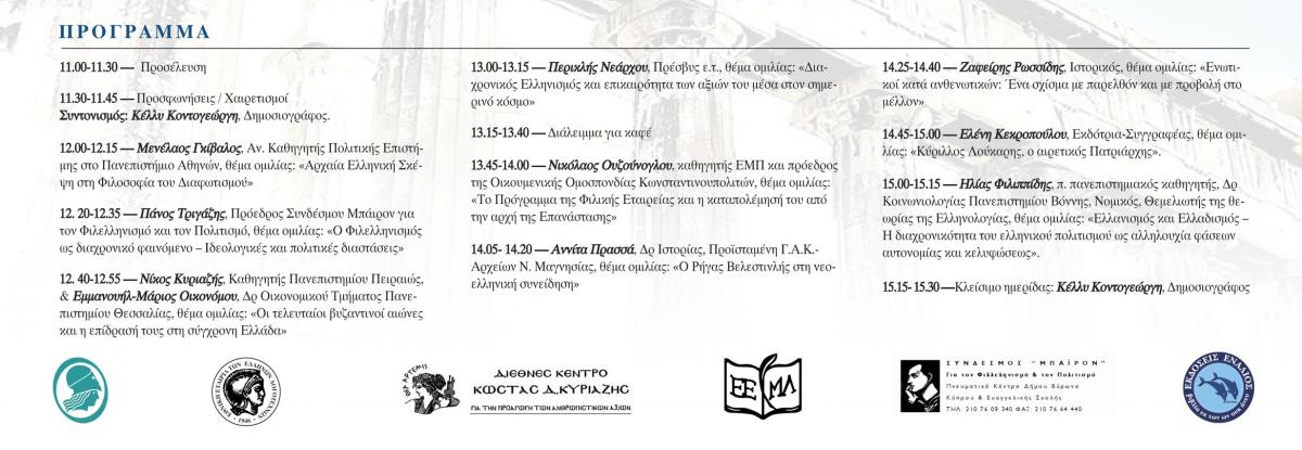 Τίτλος της ημερίδας είναι «Καταβολές του ελληνισμού. Η Οδύσσεια του ελληνισμού μέσα στον ιστορικό χρόνο». Διοργανώνεται από τις εκδόσεις Ενάλιος, το Ινστιτούτο Δημοκρατίας του Πανεπιστημίου Πειραιώς, το Διεθνές Κέντρο Κώστας Κυριαζής, την Εθνική Εταιρεία Ελλήνων Λογοτεχνών, την Ελληνική Εταιρεία Μεταφραστών Λογοτεχνίας, την Ένωση Ελλήνων Βιβλιοθηκονόμων και Επιστημόνων Πληροφόρησης, και το Σύνδεσμο Μπάιρον για τον Φιλελληνισμό.