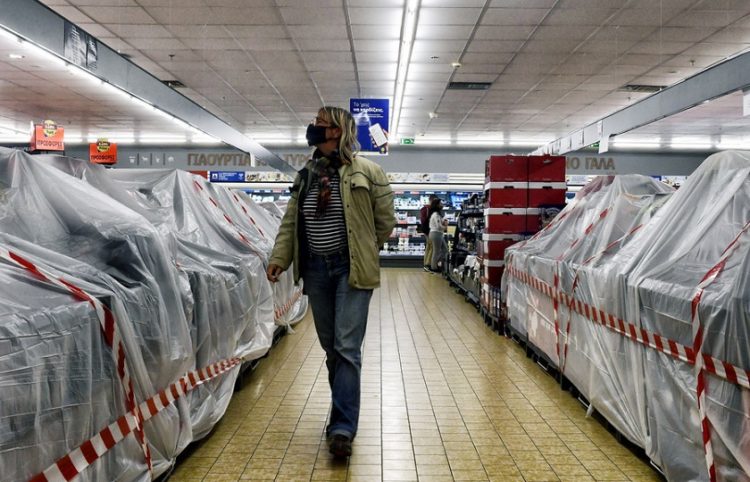 Μετά από σχετικά λίγο καιρό επιστρέφουν οι κόκκινες κορδέλες στα ράφια των σουπερμάρκετ, ενδεικτικό του ποια είδη απαγορεύεται να πωλούνται όσο διαρκούν τα έκτακτα μέτρα για την πανδημία.