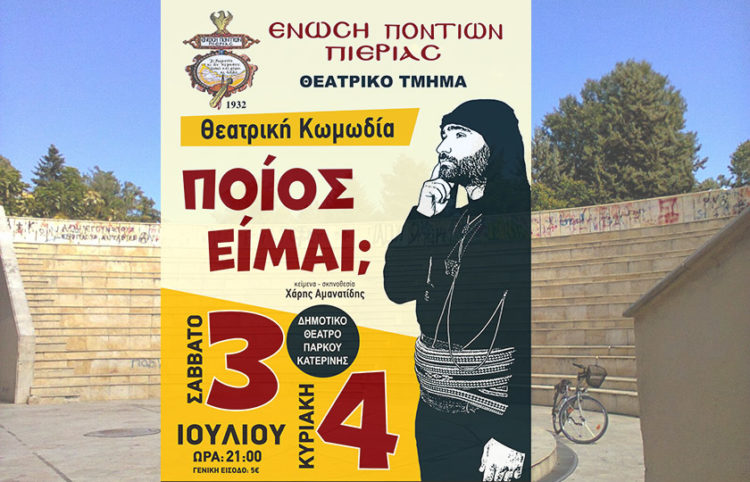 Η κωμωδία Ποίος είμαι; που έγραψε στην ποντιακή διάλεκτο και σκηνοθετεί ο Χάρης Αμανατίδης ανεβαίνει το Σάββατο 3 και την Κυριακή 4 Ιουλίου στις 21:00 στο Δημοτικό Θέατρο Πάρκου Κατερίνης.
