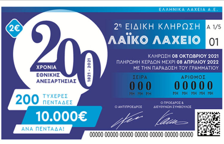 Λίγες ημέρες έχουν απομείνει μέχρι τη νέα ειδική κλήρωση του Λαϊκού Λαχείου «200 Χρόνια Εθνικής Ανεξαρτησίας». Την Παρασκευή, 8 Οκτωβρίου, τρεις ημέρες μετά την καθιερωμένη κλήρωση της Τρίτης, το παιχνίδι θα μοιράσει έπαθλα των 10.000 ευρώ σε 200 νικητές.