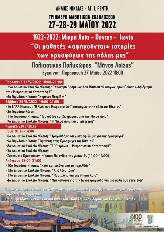 Συνεχίζοντας τις επετειακές εκδηλώσεις για τα 100 χρόνια από τη Μικρασιατική Καταστροφή, ο Δήμος Νίκαιας – Αγίου Ιωάννη Ρέντη δίνει βήμα σε μαθητές και μαθήτριες προκειμένου να αφηγηθούν ιστορίες των προσφύγων.
