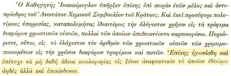 Η συμβολή του στη δημόσια υγεία επεκτείνεται και στη διατροφή: Από το 1947 υπήρξε πολέμιος της προσθήκης ουσιών –κυρίως χρωστικών– στα τρόφιμα, είχε αντιδράσει μάλιστα στην εισαγωγή στη χώρα μας 18 συνθετικών χρωστικών, που θεωρούνταν αβλαβείς στην Αμερική. Στην ομιλία που εκφώνησε ο καθηγητής Φαρμακευτικής Χημείας Γεώργιος Τσατσάς κατά το επιστημονικό μνημόσυνο για τον Ιωακείμογλου στην Ακαδημία Αθηνών, διαβάζουμε σχετικά: