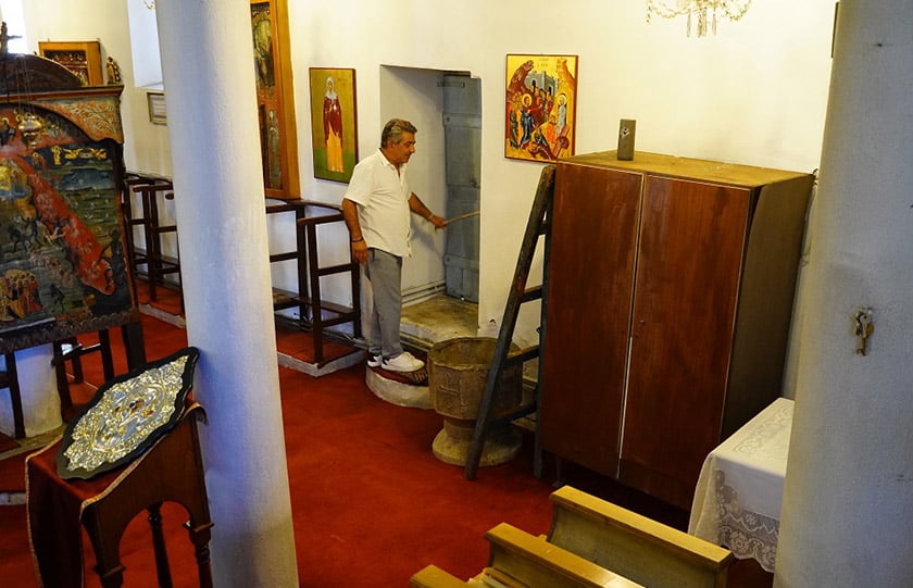 Δείχνοντάς μας την κολυμβήθρα, αναφέρει πως σ’ αυτήν γίνονταν βαφτίσεις μέχρι και τη δεκαετία του 1960 – και μάλιστα στο σημείο όπου βρίσκεται μέχρι σήμερα, καθώς ήταν πολύ βαριά για να την μετακινούν. Η κολυμβήθρα βρίσκεται περίπου στη μέση της δεξιάς πλευράς του ναού, μπροστά από μια σχετικά μικρή ξύλινη πόρτα βάρους 350 κιλών, βαμμένη εσωτερικά με γαλάζια λαδομπογιά. «Την λέμε “αγιορείτικη πόρτα” γιατί μοιάζει με αυτές του Αγίου Όρους», εξηγεί, και με την αφορμή αυτήν ξεδιπλώνει μια πονεμένη πλευρά σχετικά με τη συντήρηση του ναού και των αντικειμένων που βρίσκονται εντός του.