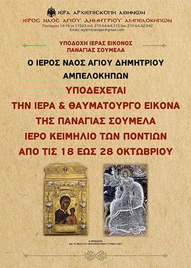 Τη θαυματουργή εικόνα της Παναγίας Σουμελά, από την ομώνυμη Ιερά Μονή στο Βέρμιο, θα υποδεχθεί ο Ιερός Ναός Αγίου Δημητρίου Αμπελοκήπων, επί της οδού Πανόρμου, σήμερα (Τρίτη 18 Οκτωβρίου) στις 18:30.