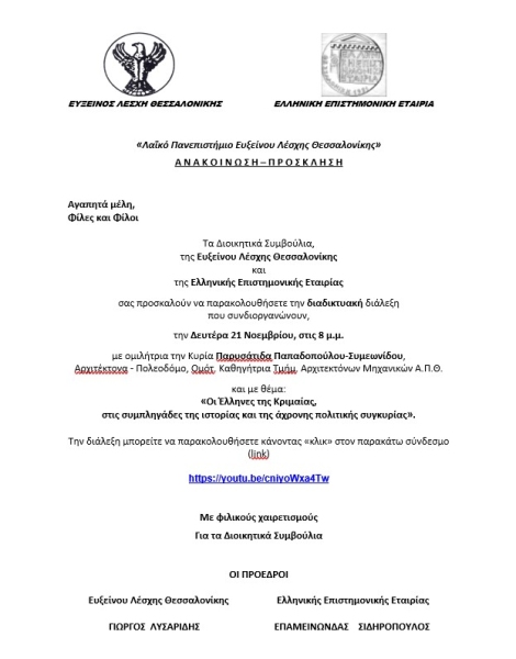 Η Εύξεινος Λέσχη Θεσσαλονίκης και η Ελληνική Επιστημονική Εταιρεία καλούν σήμερα, στις 20:00, στη διαδικτυακή διάλεξη Οι Έλληνες της Κριμαίας, στις συμπληγάδες της ιστορίας και της άχρονης πολιτικής συγκυρίας της ομότιμης καθηγήτριας του τμήματος Αρχιτεκτόνων Μηχανικών ΑΠΘ Παρυσάτιδας Παπαδοπούλου-Συμεωνίδου.