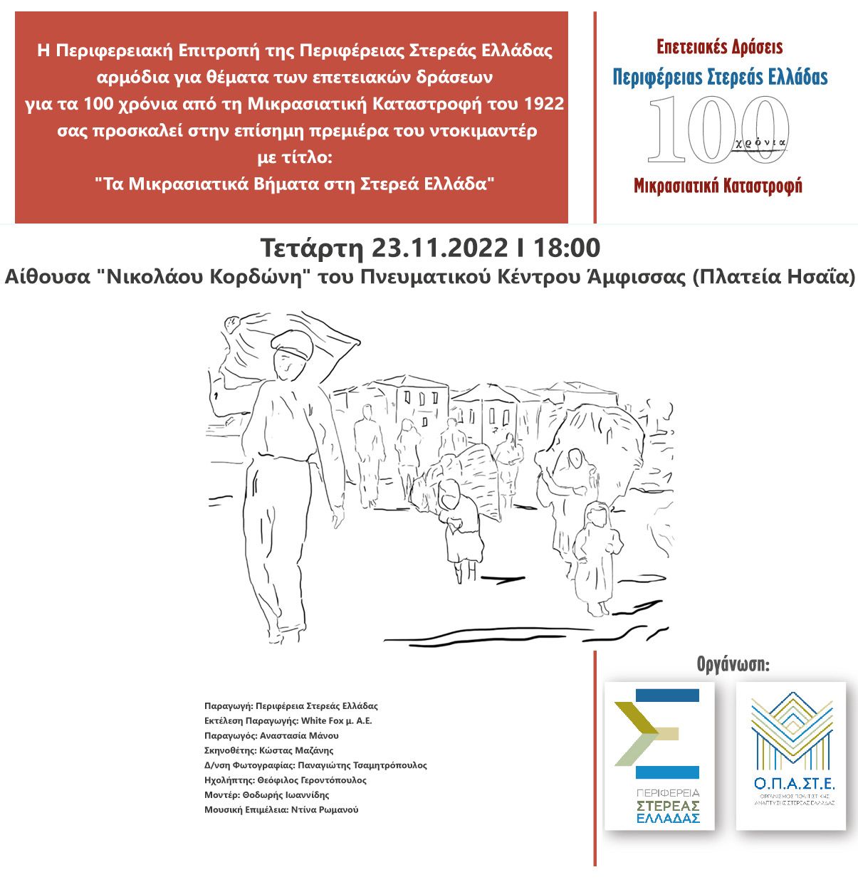 Ντοκιμαντέρ με τίτλο «Βήματα Μικρασιατών στη Στερεά Ελλάδα» παρουσιάζεται σήμερα από την Περιφέρεια Στερεάς Ελλάδας, στην Άμφισσα, στα πλαίσια της επετείου των 100 χρόνων από τη Μικρασιατική Καταστροφή.