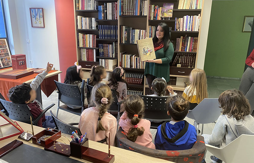 Στη συνέχεια ξεναγήθηκαν στους χώρους του Συλλόγου, παρατήρησαν τους πίνακες που κοσμούν την κεντρική αίθουσα, είδαν αντίγραφα από αυθεντικά γραμματόσημα – δελτάρια του Πόντου, επισκέφθηκαν το λαογραφικό τμήμα όπου γνώρισαν τα αντικείμενα εκείνης της εποχής, αλλά και τη βιβλιοθήκη – αναγνωστήριο, όπου άκουσαν με πολύ ενδιαφέρον αποσπάσματα από το βιβλίο Παραμύθια από τον Πόντο.
