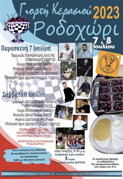Την Γιορτή Κερασιού διοργανώνει για άλλη μια χρονιά ο Πολιτιστικός Σύλλογος Ροδοχωρίου «Οι Κομνηνοί» αύριο, Παρασκευή, 7, και το Σάββατο, 8 Ιουλίου.