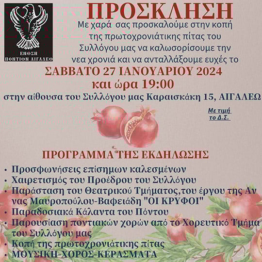 Με μια μεγάλη γιορτή καλωσορίζει το 2024 η Ένωση Ποντίων Αιγάλεω, κόβοντας και τη βασιλόπιτά της.