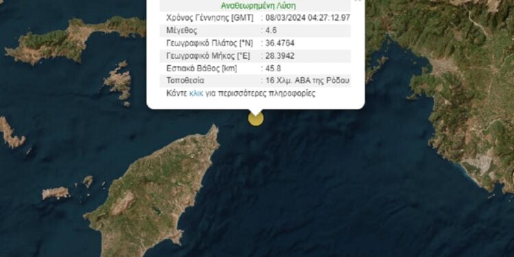 Σεισμική δόνηση 4,6 βαθμών της κλίμακας Ρίχτερ, σημειώθηκε στις σήμερα 6:27 το πρωί ανοιχτά της Ρόδου.