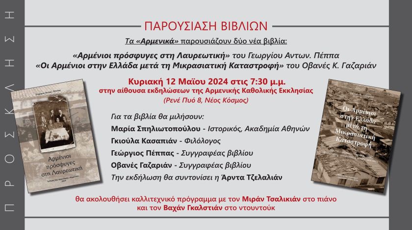 Το περιοδικό Αρμενικά καλεί, την Κυριακή 12 Μαϊου 2024, στις 19:30, στην παρουσίαση δύο νέων βιβλίων στην αίθουσα εκδηλώσεων της Αρμενικής Καθολικής Εκκλησίας (Ρενέ Πυό 8) στο Νέο Κόσμο. Πρόκειται για τα βιβλία: