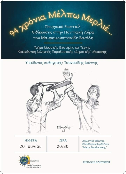 Πτυχιακό ρεσιτάλ ειδίκευσης στην ποντιακή λύρα, τον κεμεντζέ, πρόκειται να δώσει αύριο, Πέμπτη, ο Βασίλης Μαυρομουστακίδης, φοιτητής του τμήματος Μουσικής Επιστήμης και Τέχνης του Πανεπιστημίου Μακεδονίας, στη Θεσσαλονίκη.