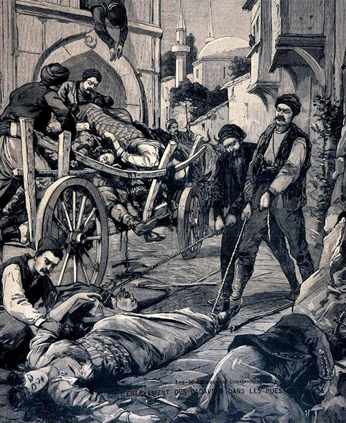 Ανάσυρση πτωμάτων μετά τη σφαγή χιλιάδων Αρμενίων στην Κωνσταντινούπολη, που ακολούθησε την επιχείρηση κατάληψης της τράπεζας. Γκραβούρα από την εφ. «Le petit Parisien», Σεπτέμβριος 1896 (πηγή: armenika.gr / Αρχείο Αγκόπ Τζελαλιάν)