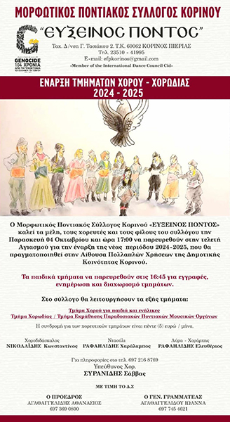 Το ένα μετά το άλλο, τα ποντιακά σωματεία εντός και εκτός Ελλάδας ξεκινούν την εκπαιδευτική τους δραστηριότητα για την περίοδο 2024-2025 – και φυσικά από αυτήν τη διαδικασία δεν θα μπορούσε να εξαιρεθεί ο Μορφωτικός Ποντιακός Σύλλογος Κορινού «Εύξεινος Πόντος».