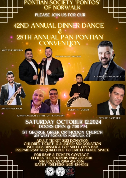 Η Ποντιακή Κοινότητα Νόργουοκ «Ο Πόντος» διοργανώνει, το Σάββατο 12 Οκτωβρίου, στις 19:00, το 42ο Ετήσιο Δείπνο-Χορό και το 28ο Ετήσιο Παμποντιακό Συνέδριο στην Ελληνορθόδοξη Εκκλησία του Αγίου Γεωργίου (238 West Rocks RD. Norwalk CT).