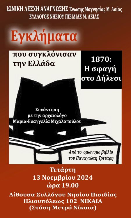 Η Ιωνική Λέσχη Ανάγνωσης της Ένωσης Μαγνησίας Μ. Ασίας σε συνεργασία με το Σύλλογο Νησίου Πισιδίας σας καλεί, σήμερα Τετάρτη 13 Νοεμβρίου, στις 19:00, στη 2η συνάντησή τους για φέτος.