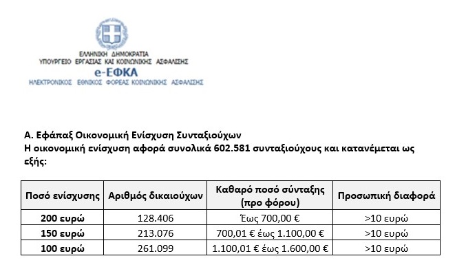 Πίνακας για το πώς κατανέμεται η εφάπαξ οικονομική ενίσχυση συνταξιούχων