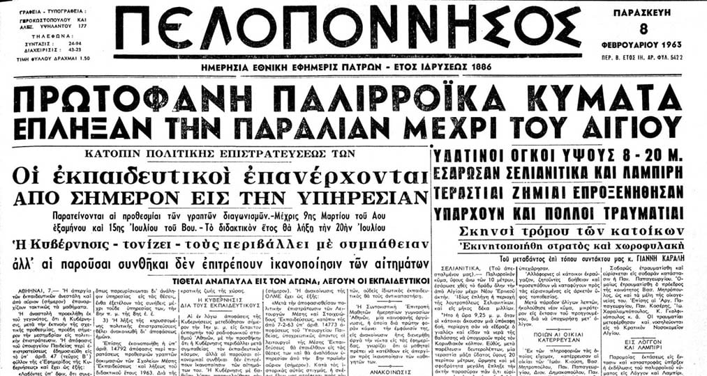 Την Παρασκευή 8 Φεβρουαρίου 1963 καταγράφονται τα πρώτα ρεπορτάζ. Στον Νεολόγο, το θέμα είναι κορυφαίο στην 4η σελίδα (οπισθόφυλλο) και έχει τίτλο: «Παλιρροιακόν κύμα έπληξε χθες την νύκτα τας ακτάς από του Αιγίου μέχρι του Ψαθοπύργου. Τα ύδατα εισώρμησαν εις βάθος από 20 έως 50 μέτρων εις την ξηράν. 10 τραυματίαι και καταρρεύσις οικιών εις Σελιανίτικα. Πανικός μεταξύ των κατοίκων. Ζημίαι και εις άλλας περιοχάς».