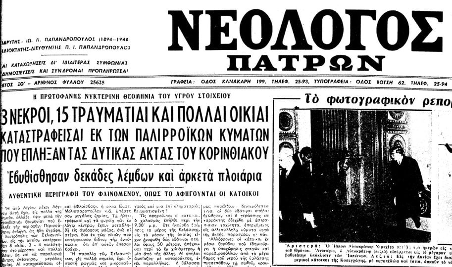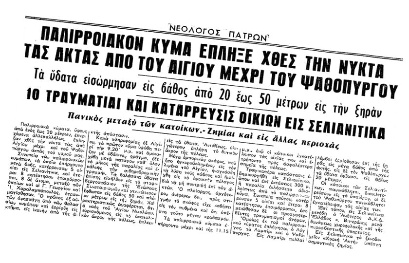 Στο ρεπορτάζ που ακολουθεί, περιγράφονται μεταξύ άλλων: «Κάτοικος των Σελιανιτίκων ανηρπάγη υπό των θαλασσίων κυμάτων και ερρίφθη εις κτήμα, εις ικανήν από της ακτής απόστασιν. Κατά πληροφορίας εξ Αιγίου, το πρώτον κύμα υψώθη περί την 9:20 μ.μ. και ομοιάζον με υδάτινο φράγμα, εξεχύθη μετά πατάγου. Τα θαλάσσια ύδατα έφθασαν εις βάθος 50 και πλέον μέτρων εις την ξηράν. Τα παλιρροϊκά κύματα επήρχοντο μέχρι και της 11:15 μ.μ., ενώ οι κάτοικοι εγκατέλειπον τας οικίας των και ετρέποντο προς ασφαλέστερα σημεία της πόλεως».