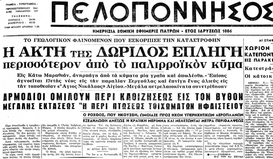 Την ίδια μέρα η Πελοπόννησος έχει ως κύριο θέμα στην πρώτη σελίδα τους νεκρούς και τις καταστροφές που προκάλεσαν τα παλιρροϊκά κύματα στην απέναντι από την Αιγιάλεια ακτή της Δωρίδας. Ο τίτλος είναι χαρακτηριστικός: «Η ακτή της Δωρίδος επλήγη περισσότερον από το παλιρροϊκόν κύμα. Εις κάτω Μαραθίαν ανηπάργη από τα κύματα μία γραία και απωλέσθη. Επίσης αγνοείται 17ετής νέος εις την παραλίαν Σεργούλας και επνίγη ένας αλιεύς εις την τοποθεσίαν Άγιος Νικόλαος Αιγίου».