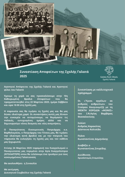 Η Αστική Σχολή Γαλατά διοργανώνει, το Σάββατο 22 Μαρτίου, στις 18:00, τη 10η Βραδιά Αποφοίτων στο χώρο της Σχολής.