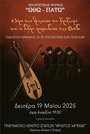 «Η λύρα τους θρηνούσε τον ξεριζωμό και το δοξάρι τραγουδούσε την ελπίδα». Αυτός είναι ο ποιητικός τίτλος της εκδήλωσης που διοργανώνει ο Πολιτιστικός Φορέας – Χορευτική Ομάδα Αρτέμιδος Σπάτων «Ωθώ Πατώ» τη Δευτέρα 19 Μαΐου, στις 19:30, ένα αφιέρωμα μνήμης για τη Γενοκτονία των Ποντίων.