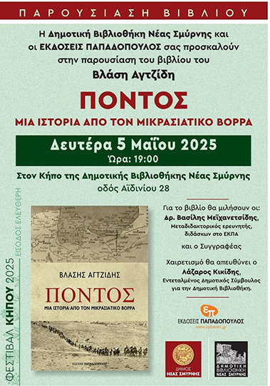 Στο όμορφο περιβάλλον του κήπου της Δημοτικής Βιβλιοθήκης Νέας Σμύρνης, σήμερα (5 Μαΐου) στις 19:00, ο Δήμος ΝΣ, η Βιβλιοθήκη και οι εκδόσεις Παπαδόπουλος παρουσιάζουν το βιβλίο του Βλάση Αγτζίδη Πόντος – Μια ιστορία από τον μικρασιατικό Βορρά.