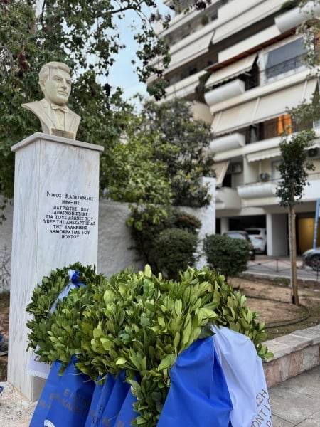 Ακολούθησε η κατάθεση στεφάνων στην προτομή του εθνικού ήρωα Νίκου Καπετανίδη, από τους δήμαρχο Κερατσινίου-Δραπετσώνας Χρήστο Βρεττάκο, τη Λένα Νίτσου-Ψαθά, την καθηγήτρια Ειρήνη Πετρίδου και τη μαθήτρια Μαρία Κολοβού εκ μέρους του 2ου Γυμνασίου Δραπετσώνας, τον Αθανάσιο Αθανασιάδη εκ μέρους του Συνδέσμου Ποντιακών Σωματείων Νοτίου Ελλάδος και Νήσων της ΠΟΕ, τον πρόεδρο του Εξωραϊστικού Πολιτιστικού Συλλόγου «Θυμαιτάδαι» Γεώργιο Δρακόπουλο και την αντιπρόεδρο Ρούσα Μιχαλοπούλου, τον ταμία Γεώργιο Καραγιαννάκη εκ μέρους της Ένωσης Κρητών Κερατσινίου-Δραπετσώνας «Το Αρκάδι», τον πρόεδρο της Ένωσης Ποντίων Σουρμένων Γιώργο Σαραφίδη, τον αντιπρόεδρο Χρήστο Μανουσαρίδη εκ μέρους της Ένωσης Ποντίων Περάματος, τον πρόεδρο της Ένωσης Ποντίων Νικαίας – Κορυδαλλού Θοδωρής Μακρίδης, τον Αθλητικό Σύλλογο Ποντίων Δραπετσώνας, τη διευθύντρια της ιστοσελίδας pontosnews.gr Χριστίνα Χαφουσίδου και την πρόεδρο της Ένωσης Ποντίων Πειραιώς-Κερατσινίου-Δραπετσώνας Αναστασία Ποιμενίδη-Ιωαννίδη.