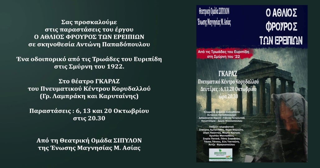 Η Ένωση Μαγνησίας Μ. Ασίας και η Θεατρική Ομάδα «ΣΙΠΥΛΟΝ» καλούν στις παραστάσεις του έργου Ο άθλιος φρουρός των ερειπίων σε σκηνοθεσία Αντώνη Παπαδόπουλου, στο θέατρο ΓΚΑΡΑΖ του Πνευματικού Κέντρου Κορυδαλλού.