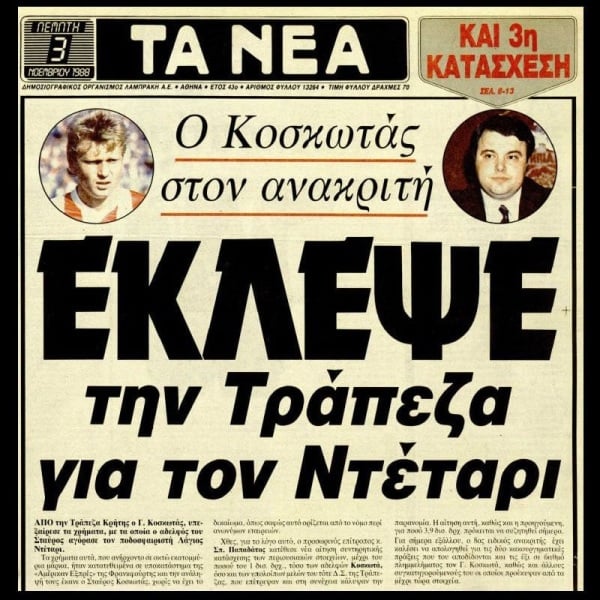 Το 1988, που ούτως ή άλλως ήταν μια εκρηκτική χρονιά με τον τότε πρωθυπουργό Ανδρέα Παπανδρέου να δίνει μάχη για την ζωή του στο Χέρφιλντ. Παράλληλα τον Οκτώβριο του 1988 ο διοικητής της Τράπεζας της Ελλάδος Δημήτριος Χαλικιάς διέταξε την τοποθέτηση του Σπύρου Παπαδάτου ως επιτρόπου στην Τράπεζα Κρήτης. Ο Παπαδάτος έφερε στην επιφάνεια ότι ο Κοσκωτάς είχε κάνει συνολική υπεξαίρεση από την Τράπεζα Κρήτης του ποσού των 33,5 δισεκατομμυρίων δραχμών. Η υπεξαίρεση των καταθέσεων είχε ξεκινήσει από την εποχή ακόμα που ήταν υπάλληλος στην Τράπεζα. Με τα χρήματα αυτά αγόρασε όλες τις επιχειρήσεις του αλλά και δωροδοκούσε δημόσια πρόσωπα.
