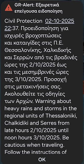 Οι παραλήπτες του μηνύματος καλούνται να είναι προσεκτικοί στις μετακινήσεις τους και να ακολουθούν τις οδηγίες των Αρχών.