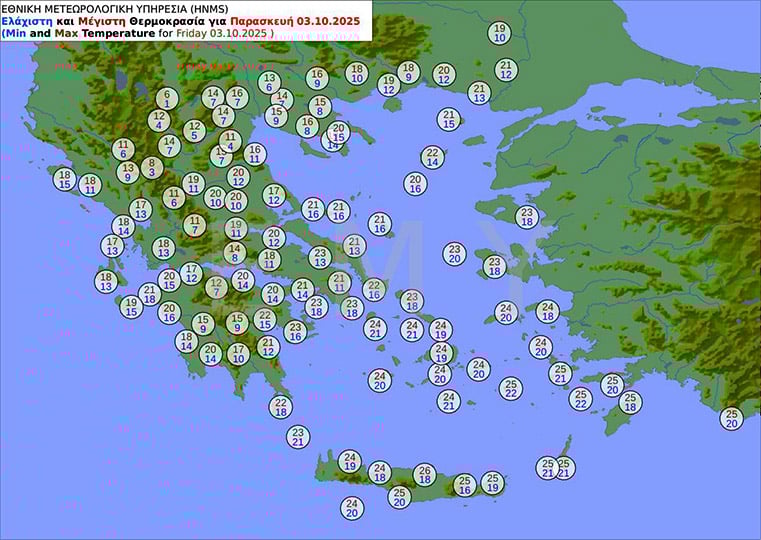 Στη Μακεδονία ο υδράργυρος δεν θα ξεπεράσει τους 15-17°, στο Ιόνιο, τα υπόλοιπα ηπειρωτικά και το βόρειο Αιγαίο τους 20-23° και μόνο στα Δωδεκάνησα, τις Κυκλάδες και την Κρήτη θα φτάσει τους 24-25°C.