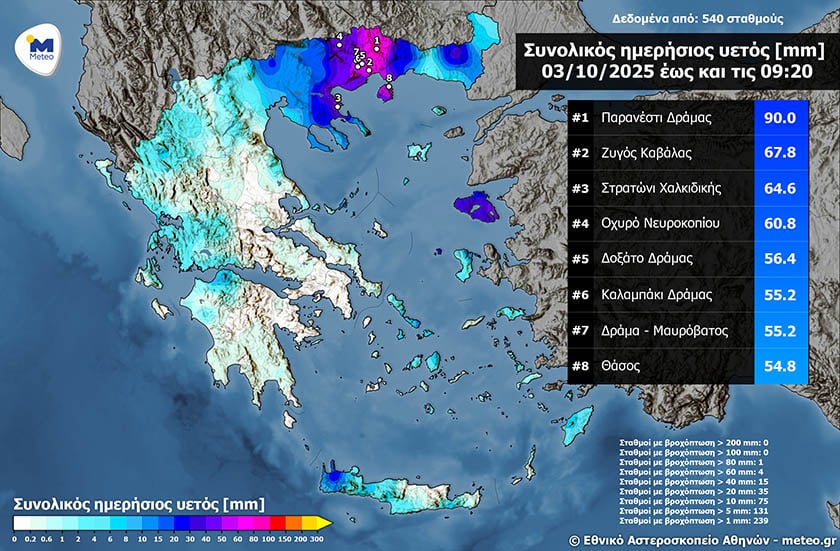 Όπως προκύπτει από το δίκτυο αυτόματων μετεωρολογικών σταθμών του meteo.gr / Εθνικού Αστεροσκοπείου Αθηνών, το μεγαλύτερο ύψος βροχής έως τις 9:20 σήμερα καταγράφηκε στο Παρανέστι Δράμας (90 χιλιοστά).