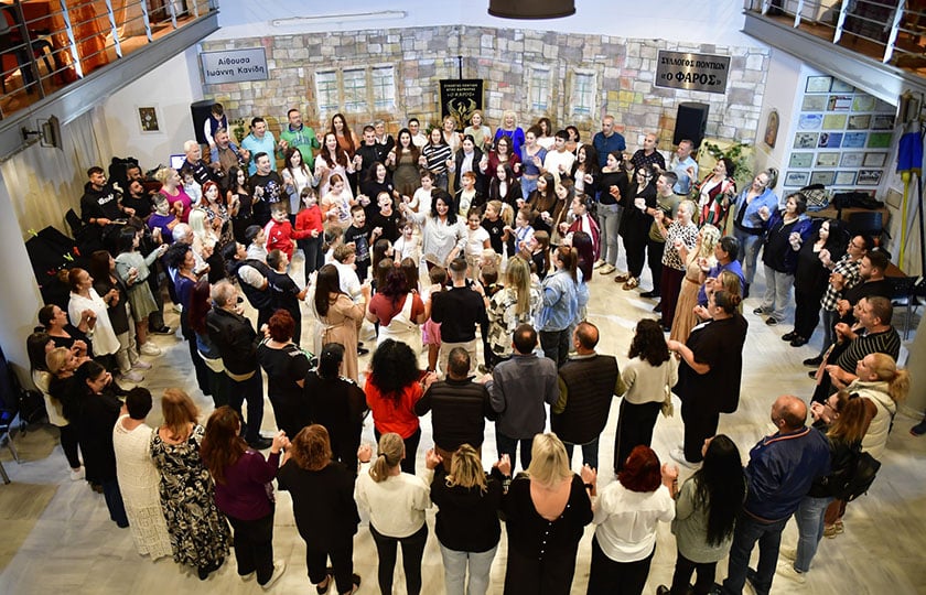 Αμέσως μετά, η λύρα του Κώστα Ορφανίδη και το νταούλι του Σάββα Ηλιάδη συνόδευσαν τη φωνή του Σταύρου Σαββίδη δίνοντας το σύνθημα ώστε μικροί και μεγάλοι χορευτές του «Φάρου» να ενωθούν στον κύκλο του ποντιακού χορού, δημιουργώντας ατμόσφαιρα γλεντιού και ζωντανής παράδοσης. Και φυσικά όλοι απόλαυσαν πλούσιο κέρασμα, ανταλλάσσοντας ευχές και χαμόγελα.