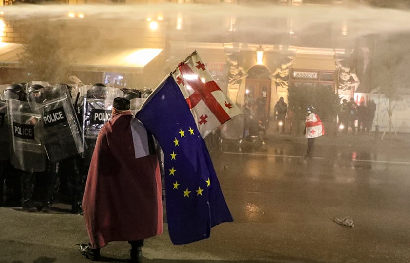 Αργά το απόγευμα, το πλήθος κρατώντας σημαίες της Γεωργίας και της ΕΕ βρισκόταν στο κέντρο της πρωτεύουσας.