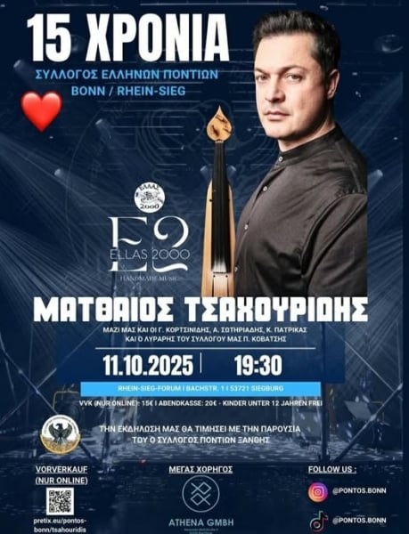 Μαζί με τον Σύλλογο Ποντίων Νομού Ξάνθης θα γιορτάσει τα 15α γενέθλιά του ο Σύλλογος Ελλήνων Ποντίων Bonn/Rhein-Sieg το Σάββατο 11 Οκτωβρίου.