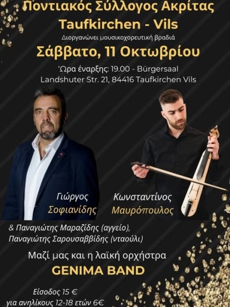 Μουσικοχορευτική βραδιά αφιερωμένη στον Πόντο οργανώνει το Σάββατο 11 Οκτωβρίου ο Ποντιακός Σύλλογος «Ακρίτας» Taufkirchen Vils.