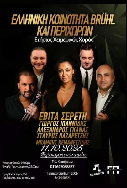 Η εκδήλωση θα φιλοξενηθεί στο χώρο Tanzsportzentrum 200b, Brühl 50321. Για κρατήσεις μπορείτε να καλείτε το τηλέφωνο 017647088877.