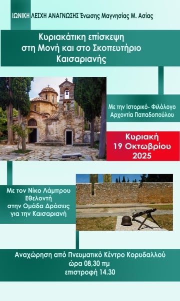 Η Ιωνική Λέσχη Ανάγνωσης της Ένωσης Μαγνησίας Μ. Ασίας διοργανώνει την Κυριακή 19 Οκτωβρίου, κυριακάτικη επίσκεψη στη Μονή Καισαριανής και στο ιστορικό Σκοπευτήριο Καισαριανής.