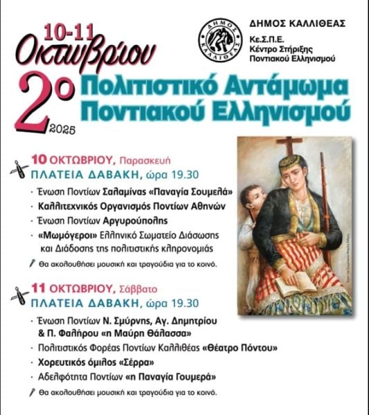 Ένα διήμερο γεμάτο Πόντο αρχίζει, απόψε, στην Πλατεία Δαβάκη του δήμου Καλλιθέας. Το 2ο Πολιτιστικό Αντάμωμα Ποντιακού Ελληνισμού που διοργανώνει το Κέντρο Στήριξης Ποντιακού Ελληνισμού (ΚεΣΠΕ) του δήμου Καλλιθέας, από τις 10 έως τις 11 Οκτωβρίου, σηκώνει αυλαία στις 19:30.