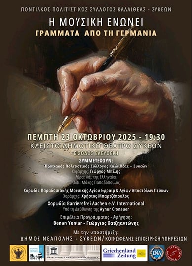 Ο Ποντιακός Πολιτιστικός Σύλλογος Καλλιθέας-Συκεών προκαλεί στην εκδήλωση «Η μουσική ενώνει – Γράμματα από τη Γερμανία» την Πέμπτη 23 Οκτωβρίου στις 19:30, στο κλειστό Δημοτικό Θέατρο Συκεών. Συμμετέχουν: