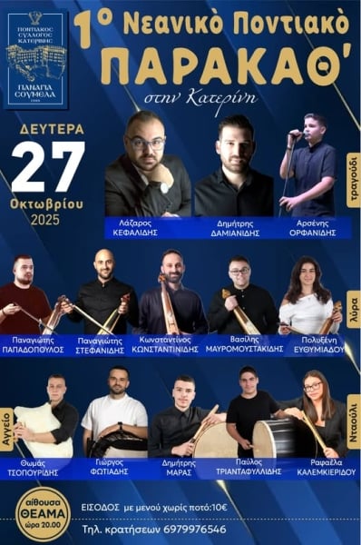 Το 1ο Νεανικό Παρακάθ’ οργανώνει τη Δευτέρα 27 Οκτωβρίου ο Ποντιακός Σύλλογος Κατερίνης «Παναγία Σουμελά» με πλήθος Ποντίων καλλιτεχνών.
