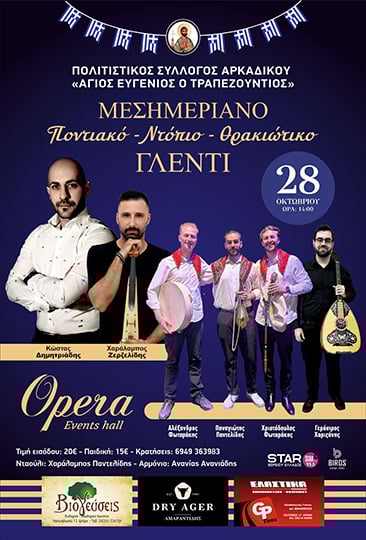 Ποντιακό, ντόπιο και θρακιώτικο γλέντι διοργανώνει ο Πολιτιστικός Σύλλογος Αρκαδικού Δράμας «Άγιος Ευγένιος ο Τραπεζούντιος» την 28η Οκτωβρίου, με τους Κώστα Δημητριάδη, Χαράλαμπο Ζερζελίδη, Αλέξανδρο και Χριστόδουλο Φωταράκη, Παναγιώτη και Χαράλαμπο Παντελίδη, Γεράσιμο Χαριζάνη και Ανανία Ανανιάδη.