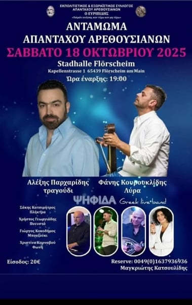 Αντάμωμα των απανταχού Αρεθουσιανών οργανώνει το Σάββατο 18 Οκτωβρίου ο Εκπολιτιστικός Εξωραϊστικός Σύλλογος Απανταχού Αρεθουσιανών «Ο Ευριπίδης» στο Flörscheim της Γερμανίας.