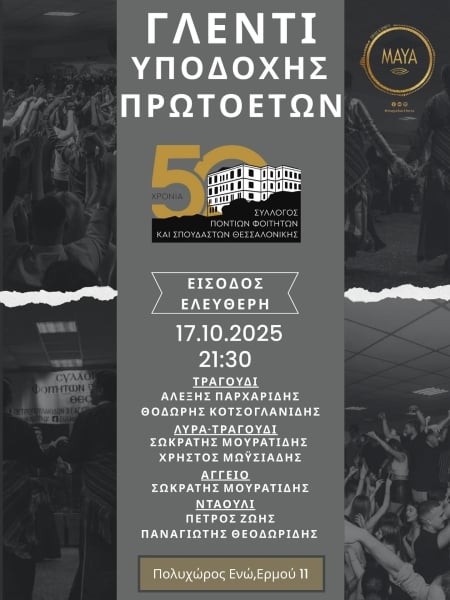 Ο Σύλλογος Ποντίων Φοιτητών και Σπουδαστών Θεσσαλονίκης υποδέχεται, την Παρασκευή 17 Οκτωβρίου 2025, τους πρωτοετείς φοιτητές μ’ ένα ποντιακό γλέντι που πάλι θα μείνει αξέχαστο.