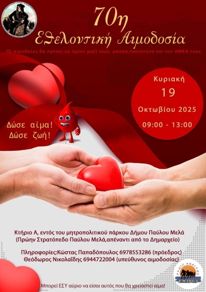 Την 70η εθελοντική αιμοδοσία οργανώνουν την Κυριακή 19 Οκτωβρίου ο Σύλλογος Ποντίων Σταυρούπολης «Ακρίτες του Πόντου», από τις 09:00 ως τις 13:00.