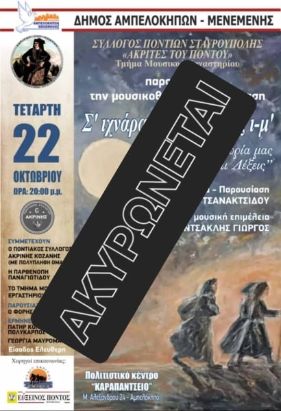 Παράλληλα, το σωματείο ενημερώνει τα μέλη και τους φίλους του ότι ακυρώνεται η αφιερωματική μουσικοθεατρική παράσταση «Σ’ ιχνάρα τη καλομάνας ι-μ’ – Ταξίδι στην ιστορία μας με νότες και λέξεις», η οποία ήταν προγραμματισμένη για την Τέταρτη 22 Οκτωβρίου στο «Καραπάντσειο» Πολιτιστικό Κέντρο (Θέατρο «Σοφία Βέμπο»).