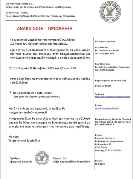 Ο Σύλλογος Ελλήνων Ποντίων Έσεν και Περιχώρων «Οι αετοί του Πόντου» καλεί την Κυριακή 19 Οκτωβρίου, στις 15:00, τους χορευτές, τα μέλη και τους φίλους να δώσουν παρών στον Αγιασμό που θα τελεστεί στο χώρο της Σερβικής Ορθόδοξης Εκκλησίας όπου γίνονται οι πρόβες του χορευτικού.